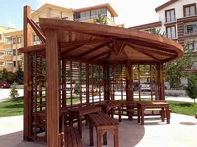 Genelde dört adet ahşap kalas kullanılarak yapılan yapıların içerisine oturmak için sandalye ya da oturaklar da monte edilir ve yapıya birleşik şekilde oluşturulur. Ahşap pergolalerin üstü, yukarıda da bahsettiğimiz gibi açık olarak tasarlanır. Üstü açık olduğu ve en az dört adet kalası dengede tutması gerektiği için, üst kısmında da kalaslar kullanılır. Burada kullanılan kalaslar genelde sarmaşık, hanımeli gibi dolambaçlı, ahşaba sarılan bitki türleri ile süslenir. Böylece insanların daha içten daha doğal bir ortamdaymışçasına huzur içinde dinlenmelerine olanak sağlayan bir ortam hazırlanmış olur.
